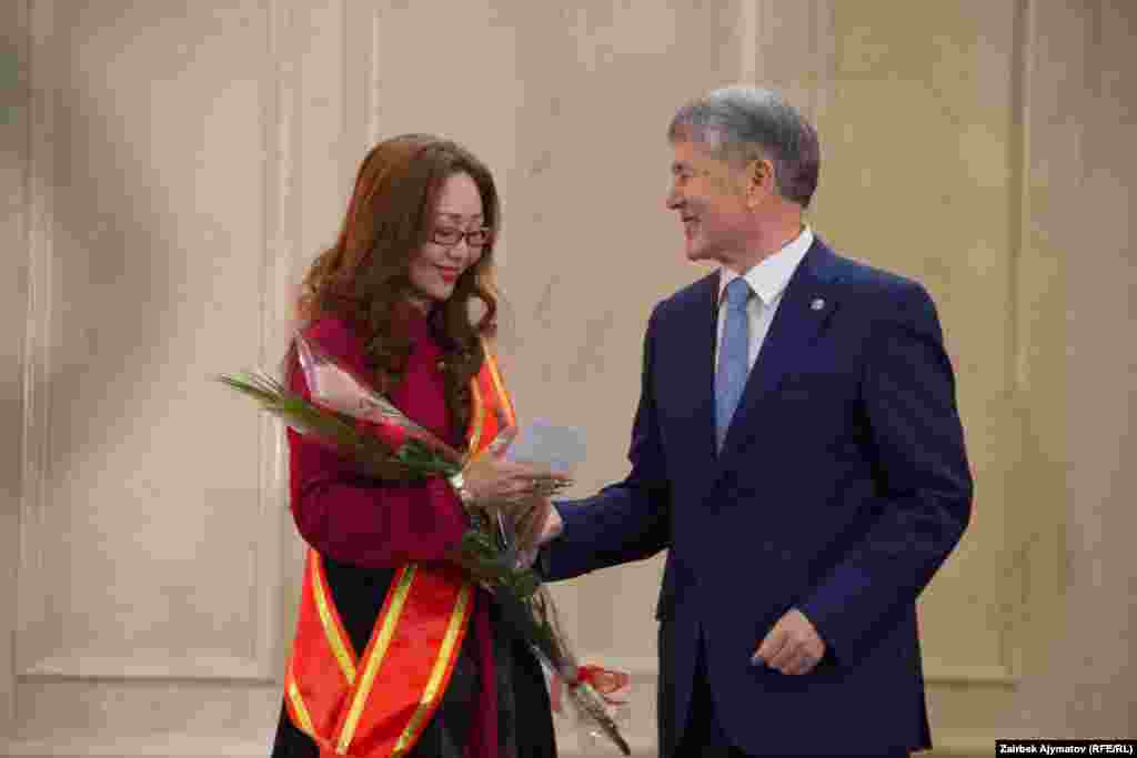Сыйлык тапшыруу салтанаты коомдук ишмер, маркум Исхак Раззаковго ыйгарылган “Кыргыз Республикасынын баатыры” наамын жана “Ак шумкар кут” орденин анын кызына тапшыруу менен башталды.