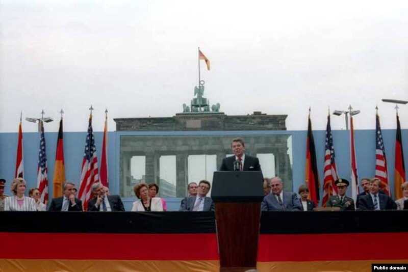 АКШ президенти Роналд Рейган Берлин дубалы менен Бранденбург дарбазасынын маңдайында сүйлөөдө. 12-июль 1987.