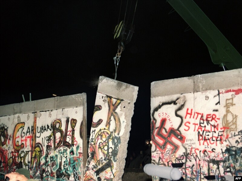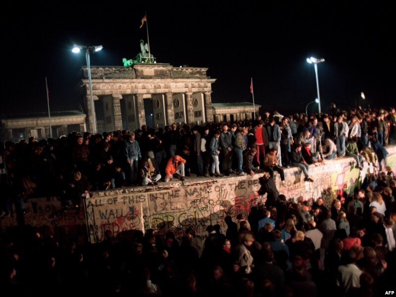 Чыгыш Берлиндин миңдеген жаштары Барденбург дарбазасынын жанында бетон коргондун үстүнө чыгып турушат. 11-ноябрь 1989