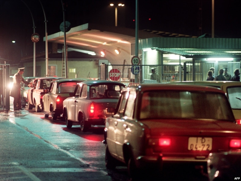 Чыгыш берлиндиктер атактуу "Trabant" жеңил машинесин минишип, ачылган чек ара бекетинен өтүү үчүн узун кезек күтүшүүдө. 10-ноябрь 1989-ж.