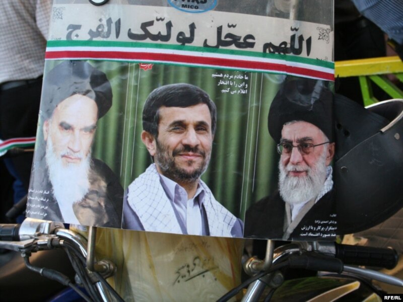 Президент Ахмадинежад Ирандын руханий көсөмү аятолла Али Хаменейи менен аятолла Рухалла Хомейнинин ортосунда. Шайлоо плакаты.