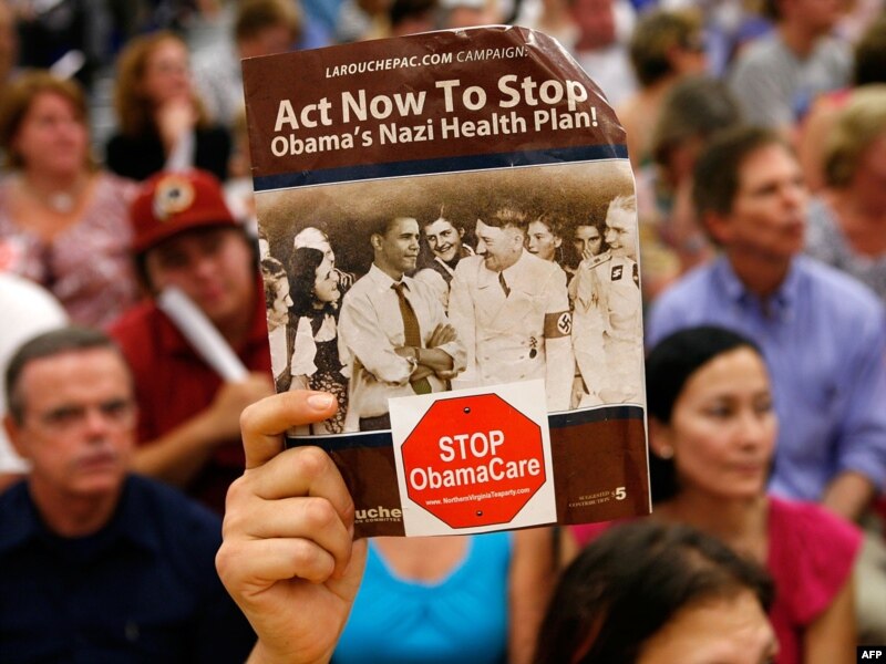Cаламаттыкты сактоо тармагын реформалоо боюнча жыйындын катышуучусу президент Обама менен Адоль Гитлердин сүрөтү бар плакатты кармап турат. 25-август. Рестон, Виржиния штаты.