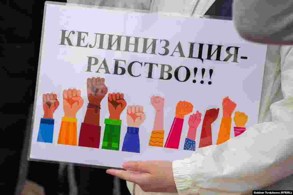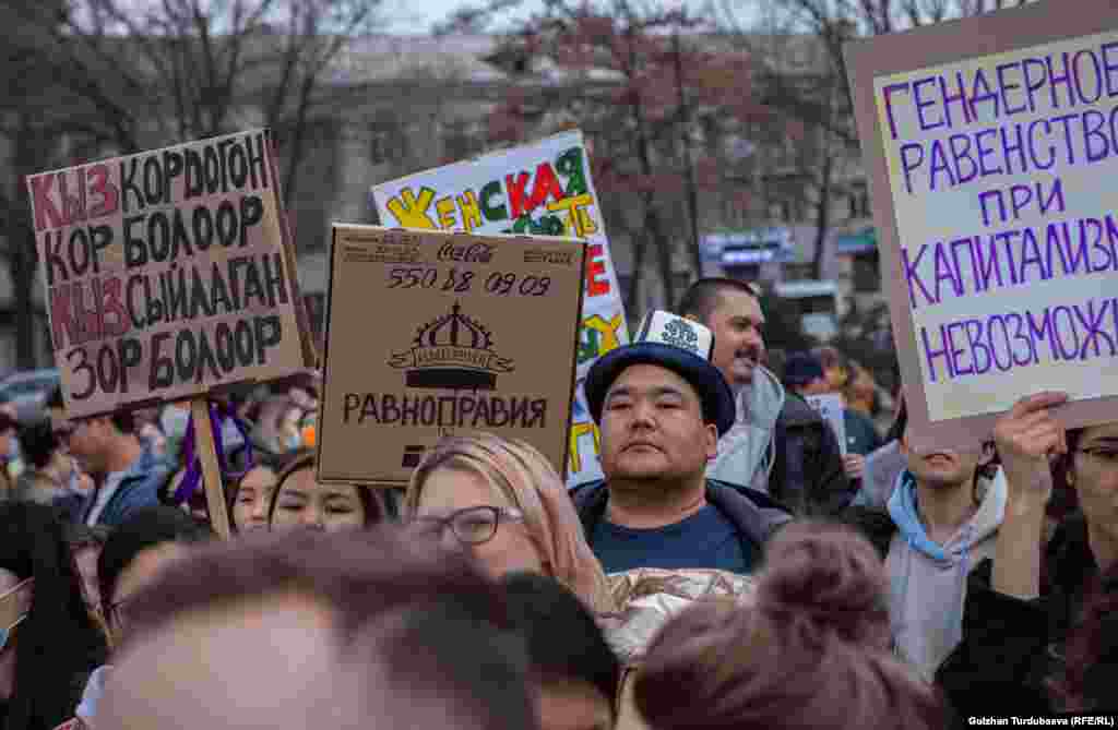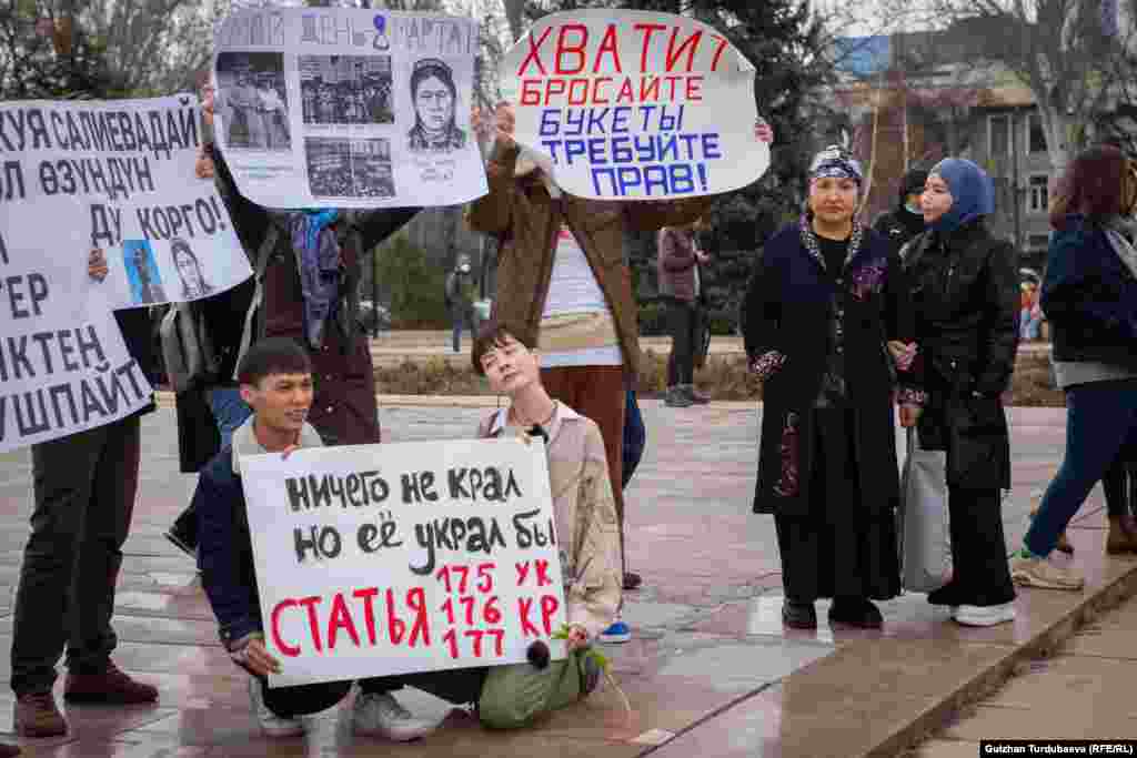 Бишкекте 8-мартта «Аялдардын тилектештик маршы» өттү. Ондогон адамдар парламент имаратынын алдына чогулуп, Чүй көчөсүн бойлоп Абдрахмнов көчөсүнүн кесилишиндеги Уркуя Салиеванын эстелигине чейин жөө барышты. Жүрүштө аялдардын укуктарына байланыштуу ураандар айтылды. Аны ырчы Зере жетектеп чыкты.