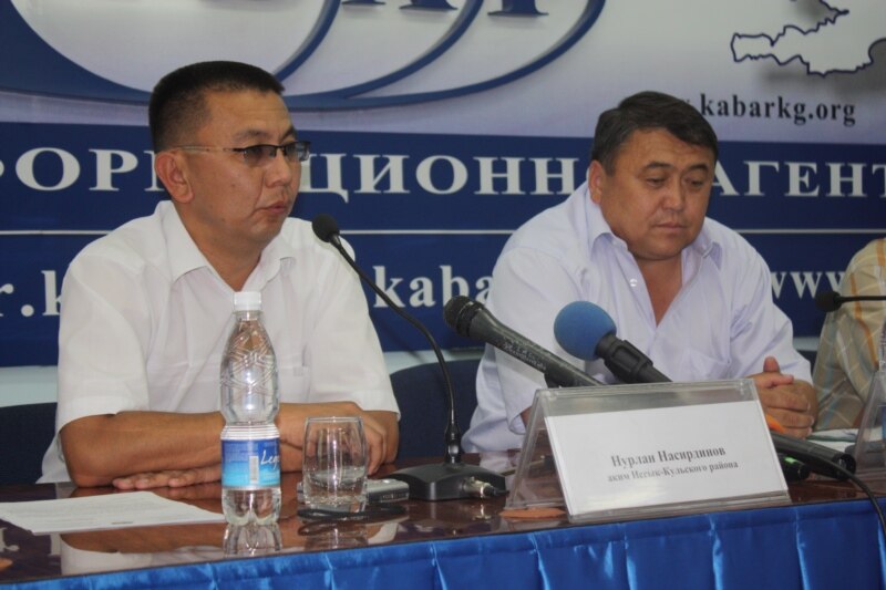 Ысык-Көл облустук ички иштер башкармалыгынын жетекчиси Жалил Илиппаев (оңдо) жана Ысык-Көл районунун акими Нурлан Насирдинов маалымат жыйынында.