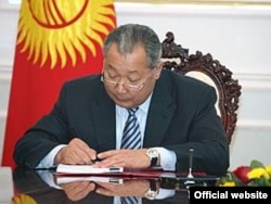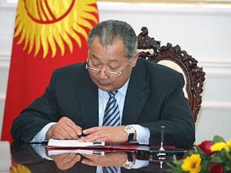 Курманбек Бакиев жаңы Конституция тууралуу мыйзамга кол коюуда, 23-октябрь, 2007-жыл