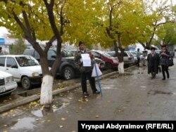 Тилемчи болуп отурган адамдарга Жалал-Абаддын көчөлөрдөн өтүп бараткан адамдар көңүлүнөн чыккан кайырларын таштап өтүшүүдө.