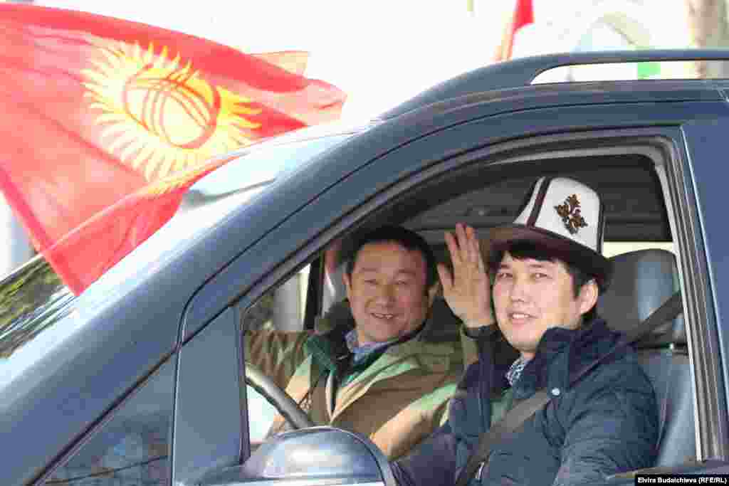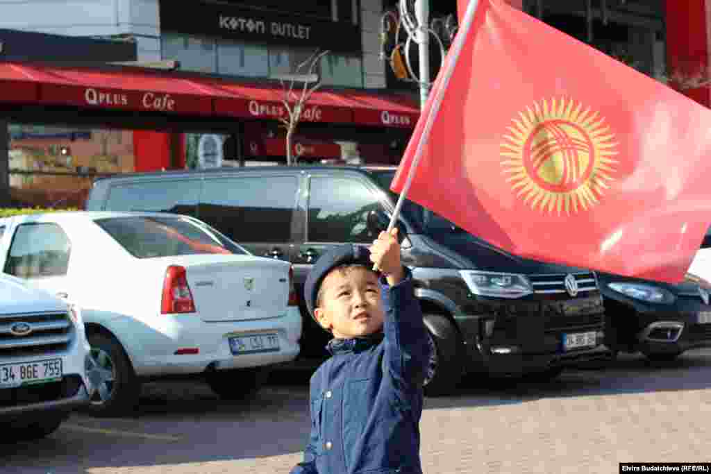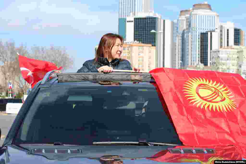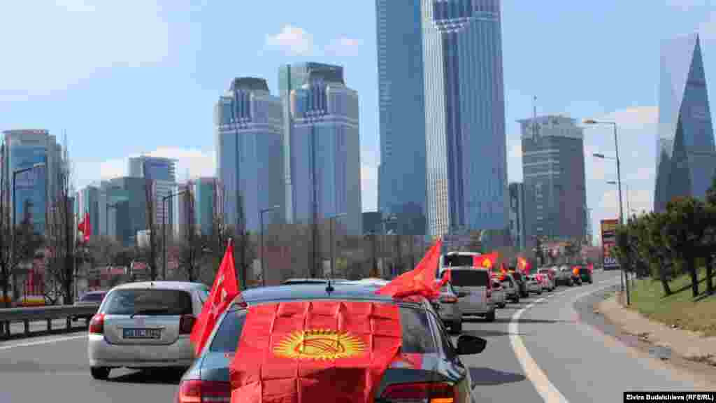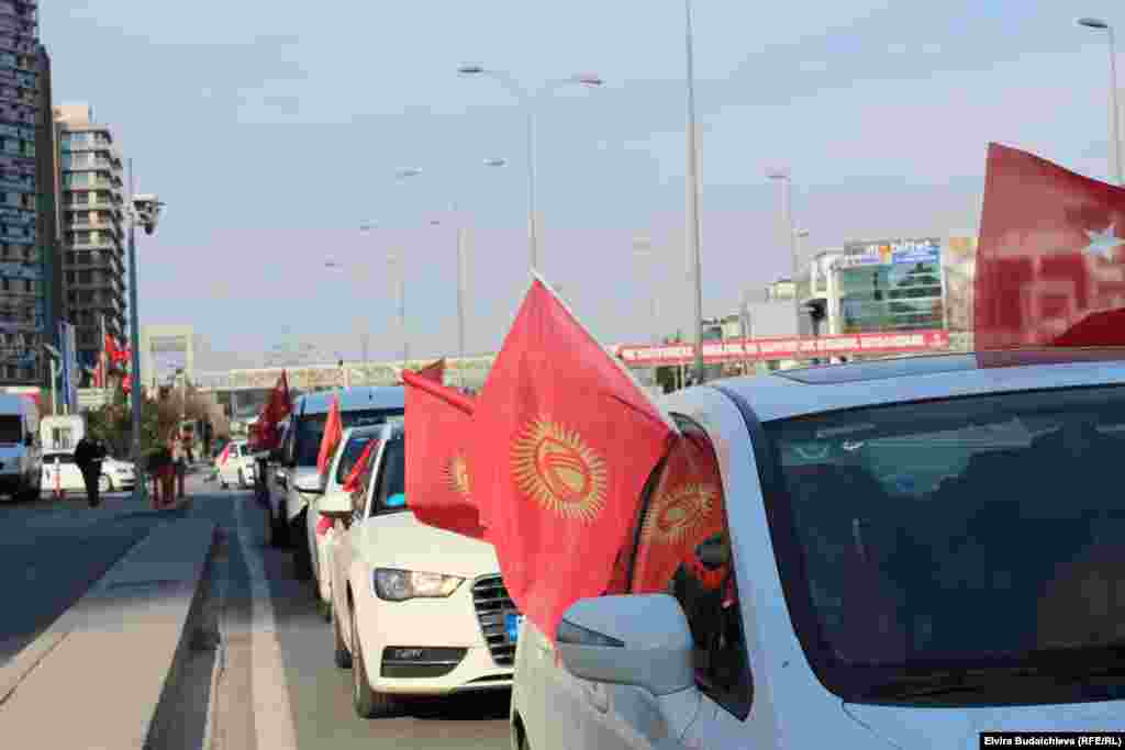 "Кыргызстан достук жана маданият" коомунун мүчөлөрү, Стамбул башкы консулдугунун кызматкерлери жана студенттер эки өлкөнүн тууларын көтөрүп алып 30 чакты автоунаа менен шаарды кыдырып чыгышты.