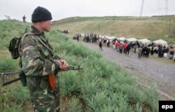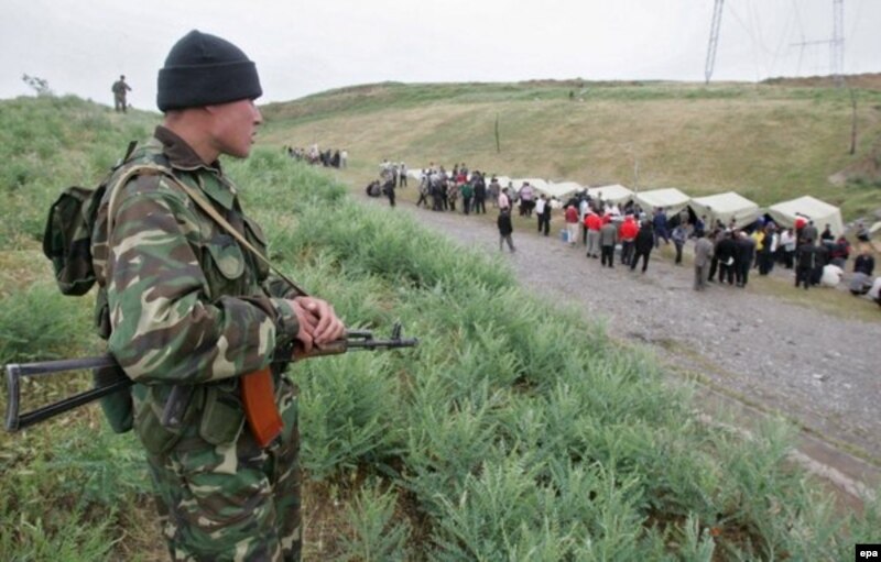 Кыргыз чекарачы өзбек качкындарынын конушуна көз салып турат. Бараш. 19-май 2005